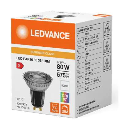 Die Ledvance LED PAR16 GU10 Reflektor 8.3W 575lm 36D - 940 Kaltweiß | Höchste Farbwiedergabe - Dimmbar - Ersatz Für 80W ist eine effiziente GU10 LED-Lampe und der perfekte Ersatz für Ihre konventionelle Halogenlampe mit 80W und einem GU10-Sockel, bei welchem die zwei Stifte einen Abstand von 10 mm zueinander haben. Zudem strahlt das Produkt Licht in der Farbtemperatur 4000K - Kaltweiß aus und punktet durch eine lange Lebensdauer.
