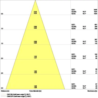 Beispiel: Wird eine Lampe mit einem Abstrahlwinkel von 60 Grad an der Decke (2,5 m Höhe) angebracht, erzeugt sie einen Lichtkegel von 2,9 Metern Durchmesser. Hat die Lampe hingegen einen Abstrahlwinkel von 120 Grad, beträgt der Lichtkegel 8,7 Meter im Durchmesser. |