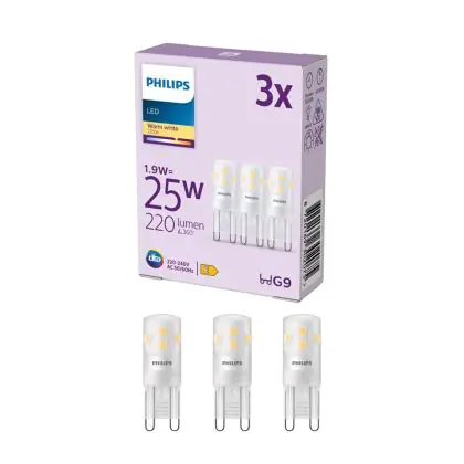 Die Mehrfachpackung 3x Philips LED Capsule G9 Matt 1.9W 220lm - 827 Extra Warmweiß ist eine effiziente G9 LED-Lampe und der perfekte Ersatz für Ihre konventionelle Halogenlampe mit W und einem G9-Sockel. Die Stifte haben einen Abstand von 9 mm. Zudem strahlt das Produkt Licht in der Farbtemperatur 2700K - Extra Warmweiß aus und punktet durch eine lange Lebensdauer.